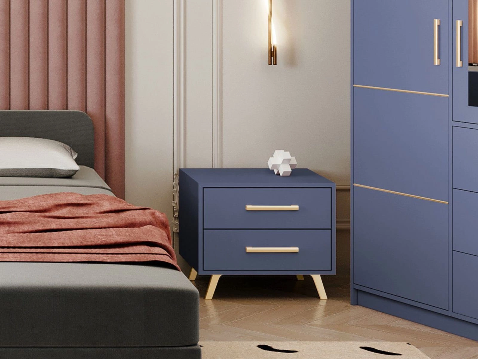 Elegancki stolik nocny w kolorze niebieskim ze złotymi elementami to wyjątkowy mebel, który łączy praktyczność z nowoczesnym, luksusowym designem. Wyposażony w 2 pojemne szuflady, oferuje wygodne miejsce do przechowywania niezbędnych przedmiotów - książek, telefonu, ładowarki, kosmetyków czy akcesoriów szkolnych - które zawsze warto mieć pod ręką przy łóżku.