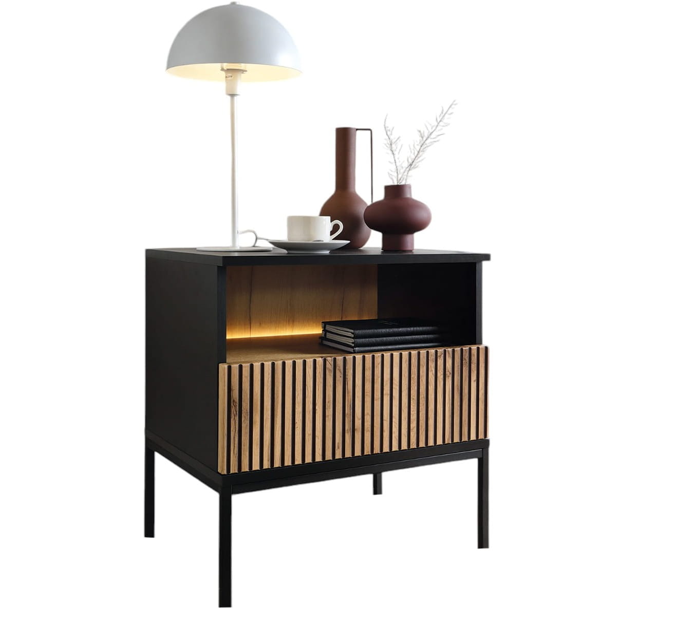 Dzięki swojej kompaktowej formie stolik nocny LINO doskonale sprawdzi się w sypialni, zapewniając wygodne miejsce na lampkę, książki czy inne przedmioty, które chcesz mieć pod ręką. Wyposażony w szufladę oraz praktyczną półkę, oferuje sprytne rozwiązania do przechowywania, jednocześnie oszczędzając miejsce.