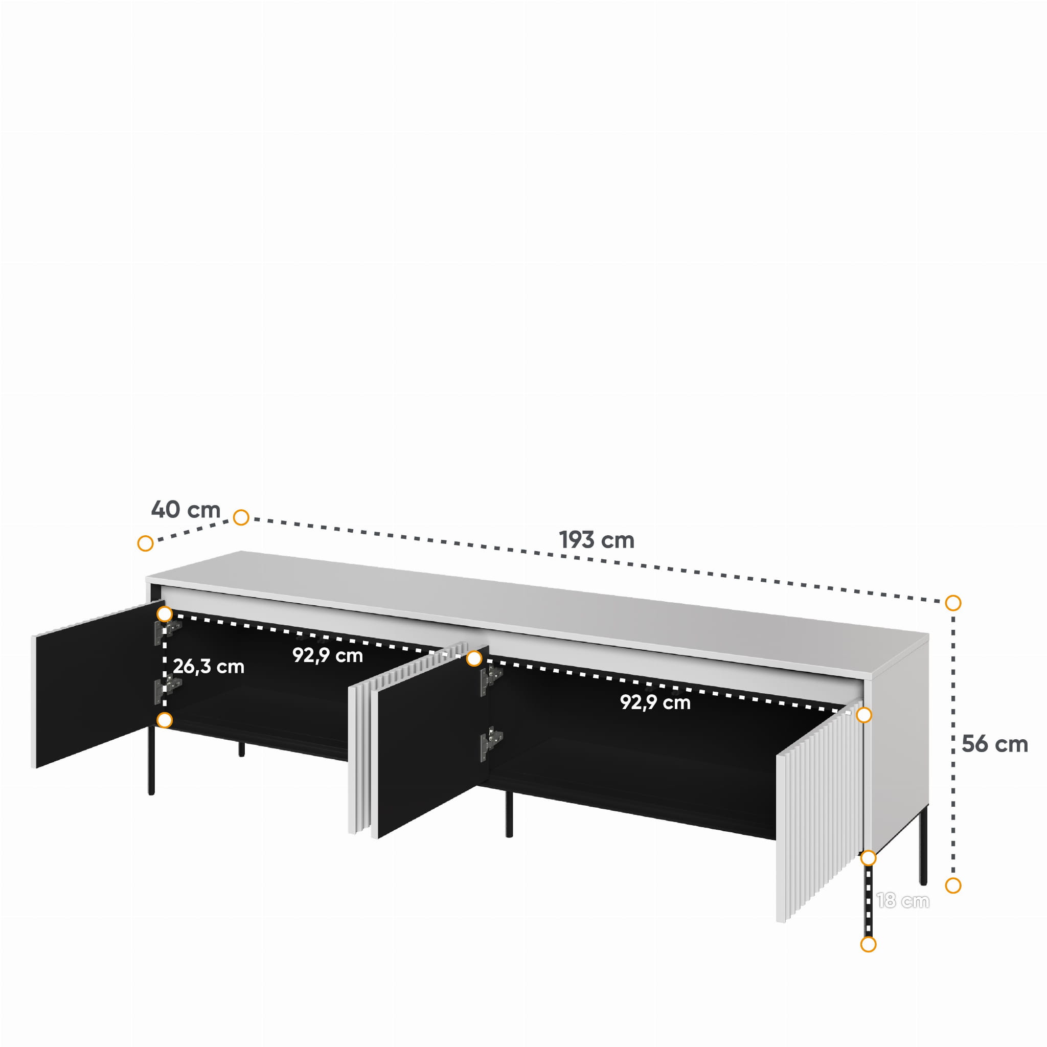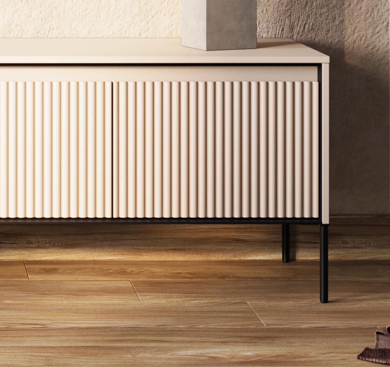 Mebel został wykonany z wysokiej jakości płyty laminowanej, dzięki czemu jest trwały i odporny na codzienne użytkowanie. Dodatkowo nowoczesna funkcja otwierania typu „push to open” eliminuje potrzebę stosowania uchwytów - wystarczy lekkie naciśnięcie frontu, aby otworzyć schowek. Dzięki temu szafka RTV prezentuje się jeszcze bardziej minimalistycznie i elegancko.