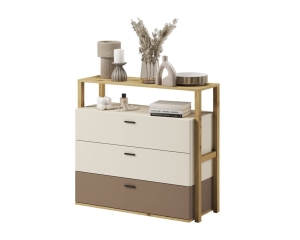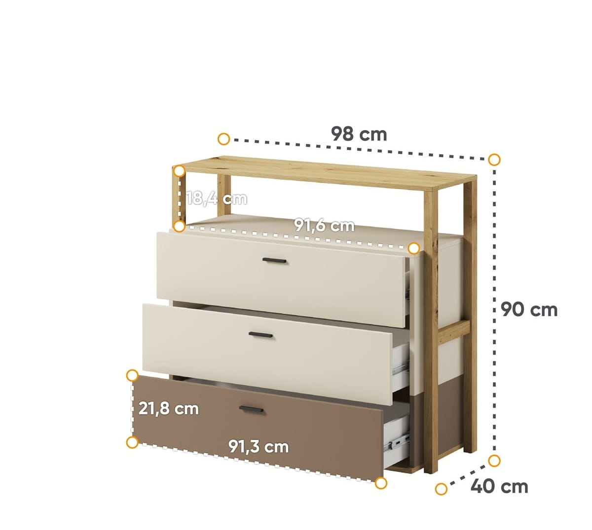 Komoda młodzieżowa z trzema szufladami i półką w kolorze beżowym z elementami dąb artisan to praktyczny i stylowy mebel, który doskonale sprawdzi się w pokoju dziecka i nastolatka. Dzięki przemyślanej konstrukcji łączy funkcjonalność z nowoczesnym designem, zapewniając mnóstwo miejsca na ubrania, akcesoria, zabawki czy szkolne drobiazgi.