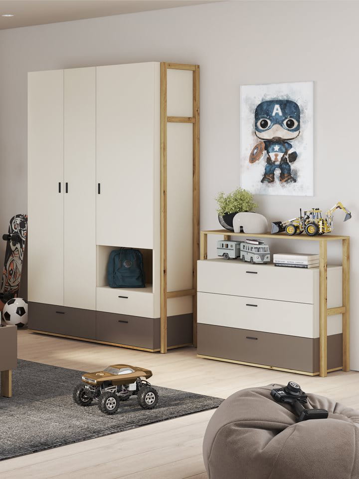 Beżowo-drewniana komoda młodzieżowa z pojemnymi szufladami