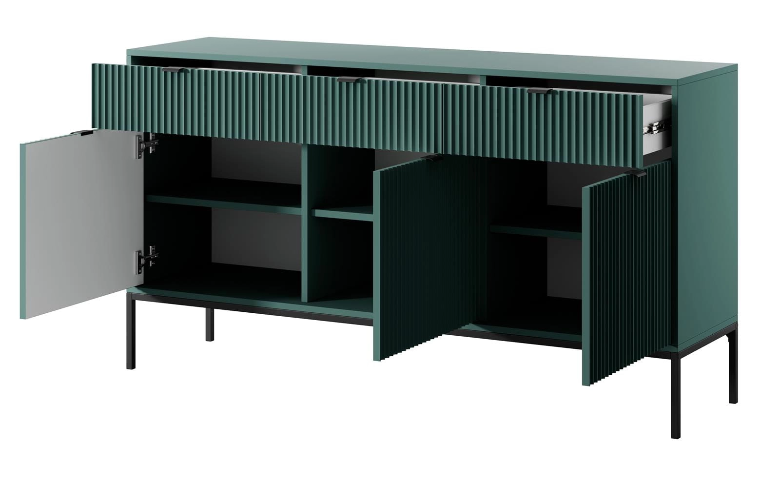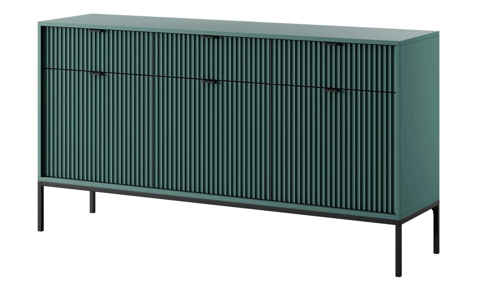Zielona komoda na czarnych nogach to wyjątkowe połączenie elegancji, nowoczesnego stylu i funkcjonalności. Jej głęboki, butelkowozielony odcień wprowadza do wnętrza nutę luksusu i spokoju, tworząc przytulną, a jednocześnie wyrafinowaną atmosferę. Charakterystyczny ryflowany front nadaje meblowi niepowtarzalny charakter i subtelną strukturę, która pięknie odbija światło i podkreśla wyjątkowy design komody. Całość dopełniają złote, minimalistyczne uchwyty - delikatny detal, który dodaje całości elegancji i podkreśla wysoką jakość wykonania.