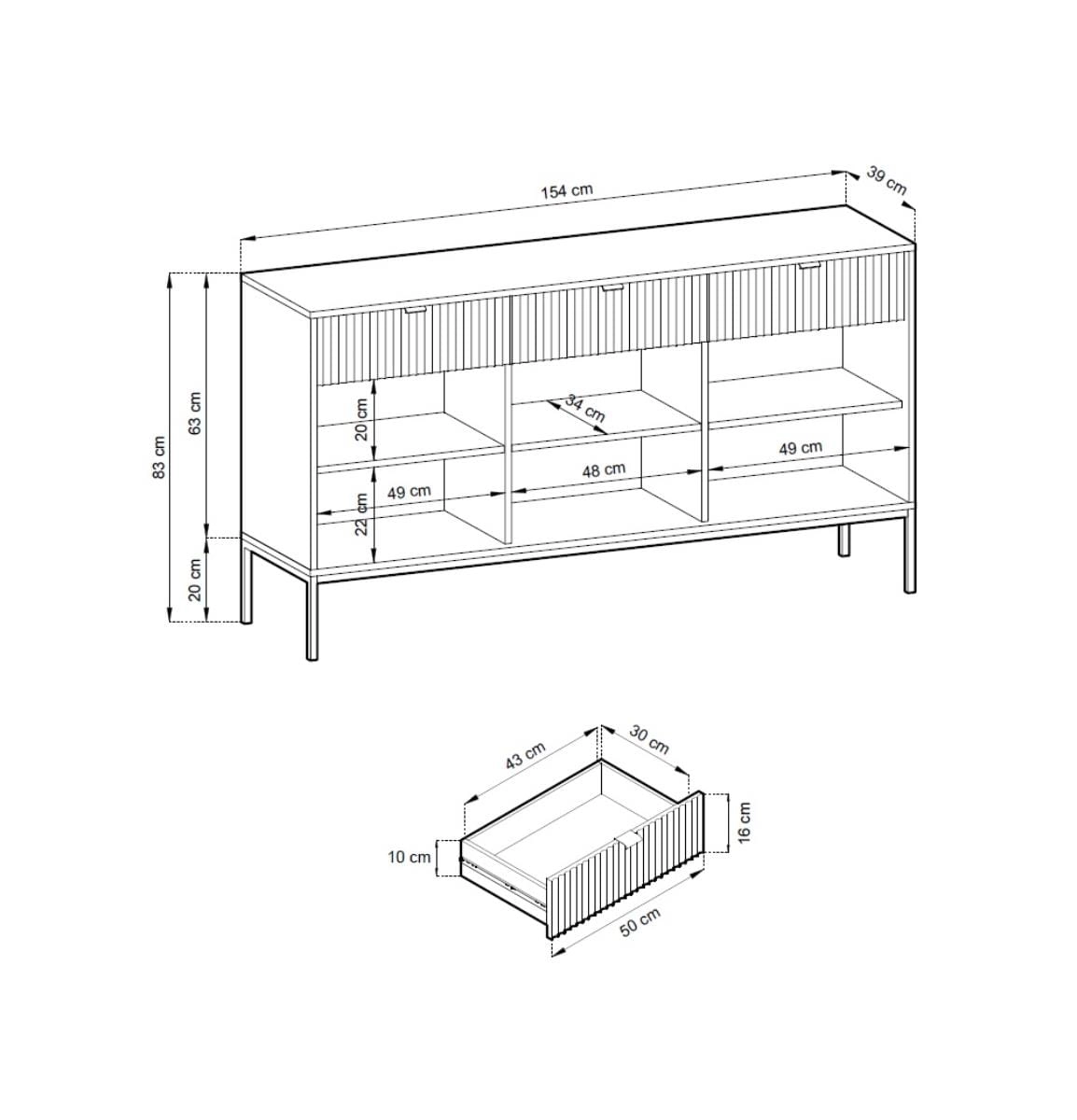 Stabilna podstawa z metalu w kolorze czarnym zapewnia trwałość i solidność konstrukcji, a jednocześnie nadaje meblowi lekkości i nowoczesnego wyrazu. Komoda została zaprojektowana z myślą o codziennym komforcie użytkowania - wyposażona w trzy pojemne szuflady oraz przestronne szafki, umożliwia wygodne przechowywanie ubrań, dodatków, dokumentów czy innych niezbędnych akcesoriów, pomagając utrzymać porządek w każdym pomieszczeniu.