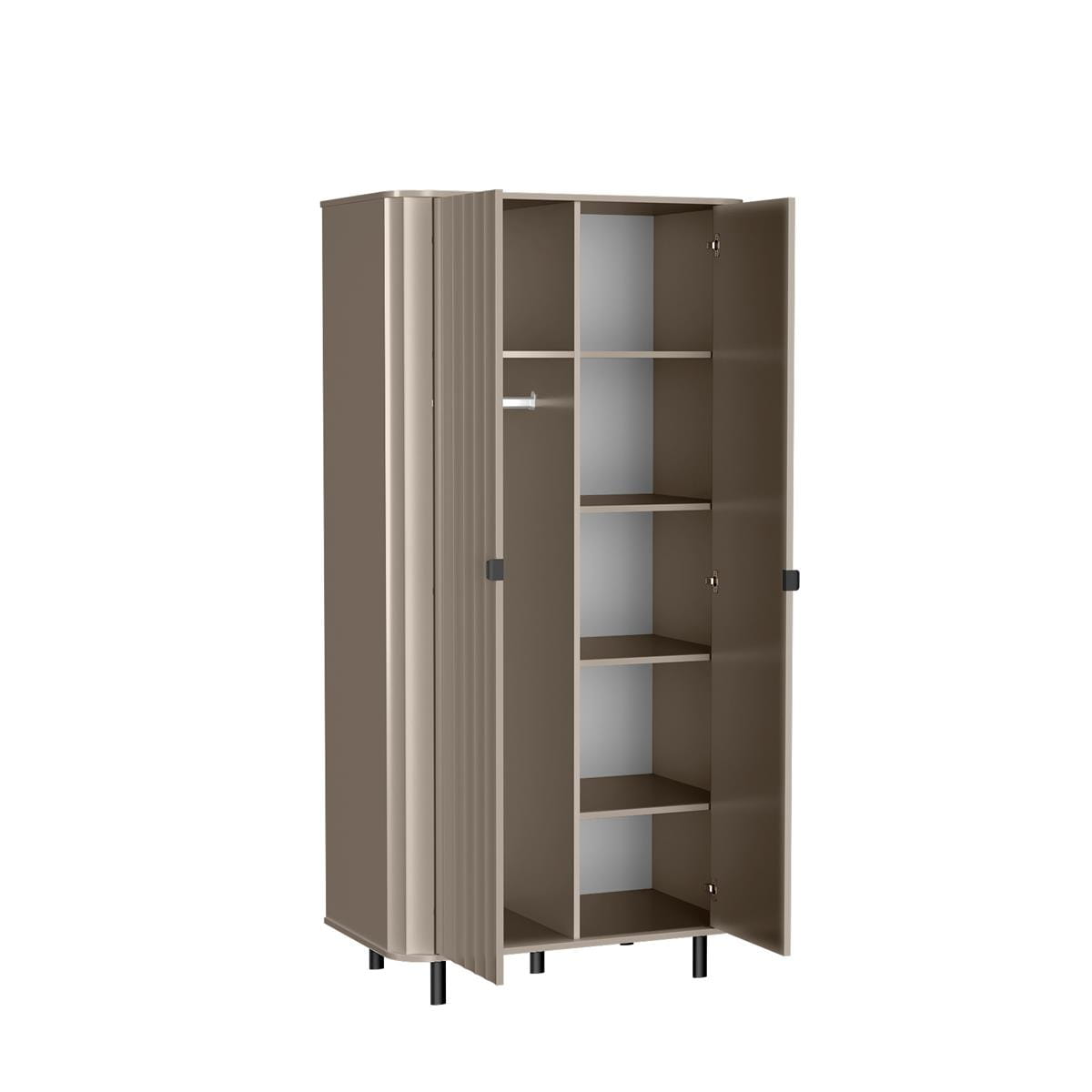 Drzwi z pionowymi lamelami nie tylko przyciągają wzrok, ale także wpisują się w aktualne trendy wnętrzarskie. Za nimi kryje się pojemne wnętrze z półkami i drążkiem na wieszaki, co pozwala na wygodne i uporządkowane przechowywanie odzieży. Ergonomiczne uchwyty w kolorze czarnym dodają kontrastu i elegancji, podkreślając minimalistyczny styl mebla.
