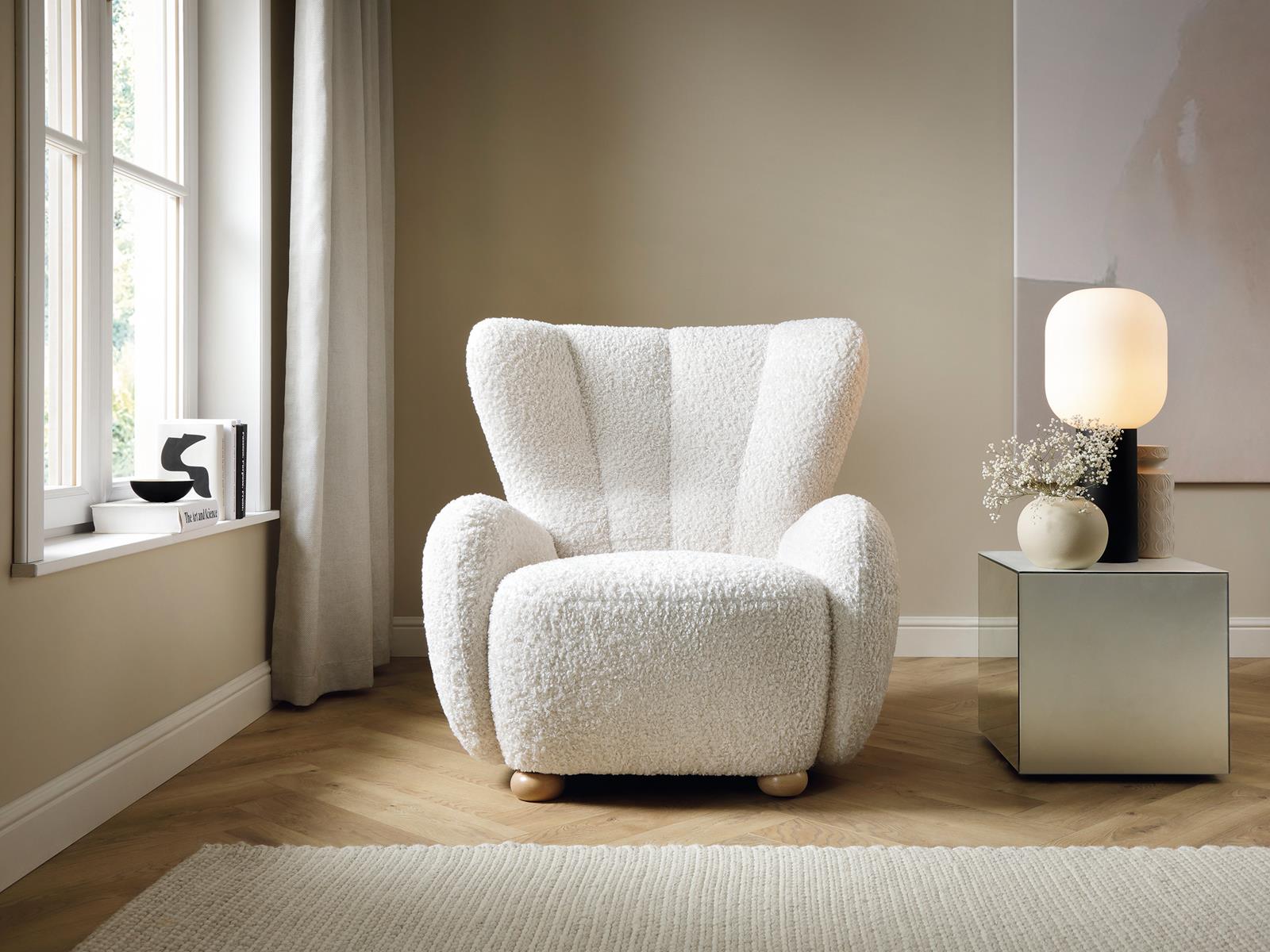 Stylowy komfortowy fotel miedziany w tkaninie baranek w stylu boho MONIS