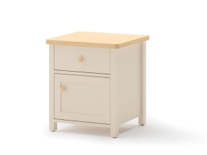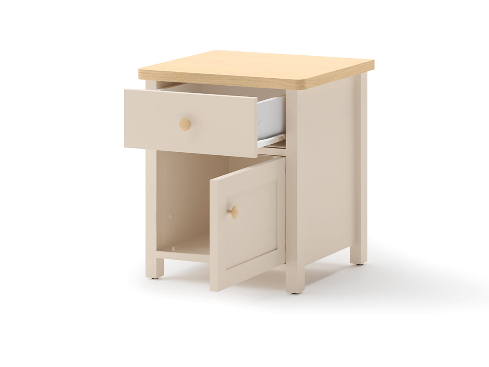 Połączenie jasnego beżu z naturalnym odcieniem drewna nadaje stolikowi lekkości i przytulnego charakteru, dzięki czemu idealnie wpisuje się w różne aranżacje - od nowoczesnych po klasyczne. Neutralna kolorystyka sprawia, że szafka nocna doskonale pasuje zarówno do pokoju dziewczynki, jak i chłopca, tworząc harmonijny wystrój w zestawieniu z innymi meblami z kolekcji.