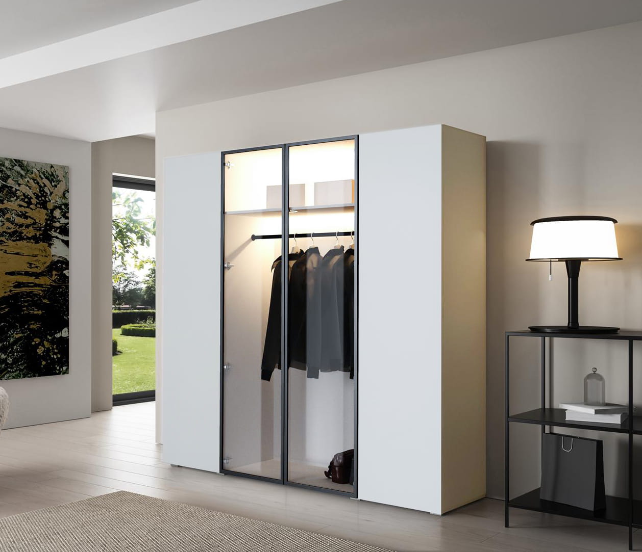 Wnętrze szafy wyposażone jest w solidny drążek na ubrania, pozwalający na wygodne przechowywanie marynarek, sukienek i płaszczy. Dodatkowe półki i schowki zapewniają przestrzeń na akcesoria, pudełka i inne elementy garderoby. Dzięki szklanym drzwiom ubrania są odpowiednio wyeksponowane, a jednocześnie chronione przed kurzem. Opcjonalne oświetlenie LED nadaje całości wyjątkowego charakteru i podkreśla elegancję mebla, tworząc nowoczesny klimat w pomieszczeniu.
