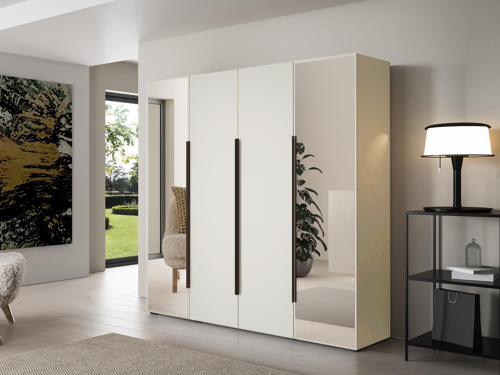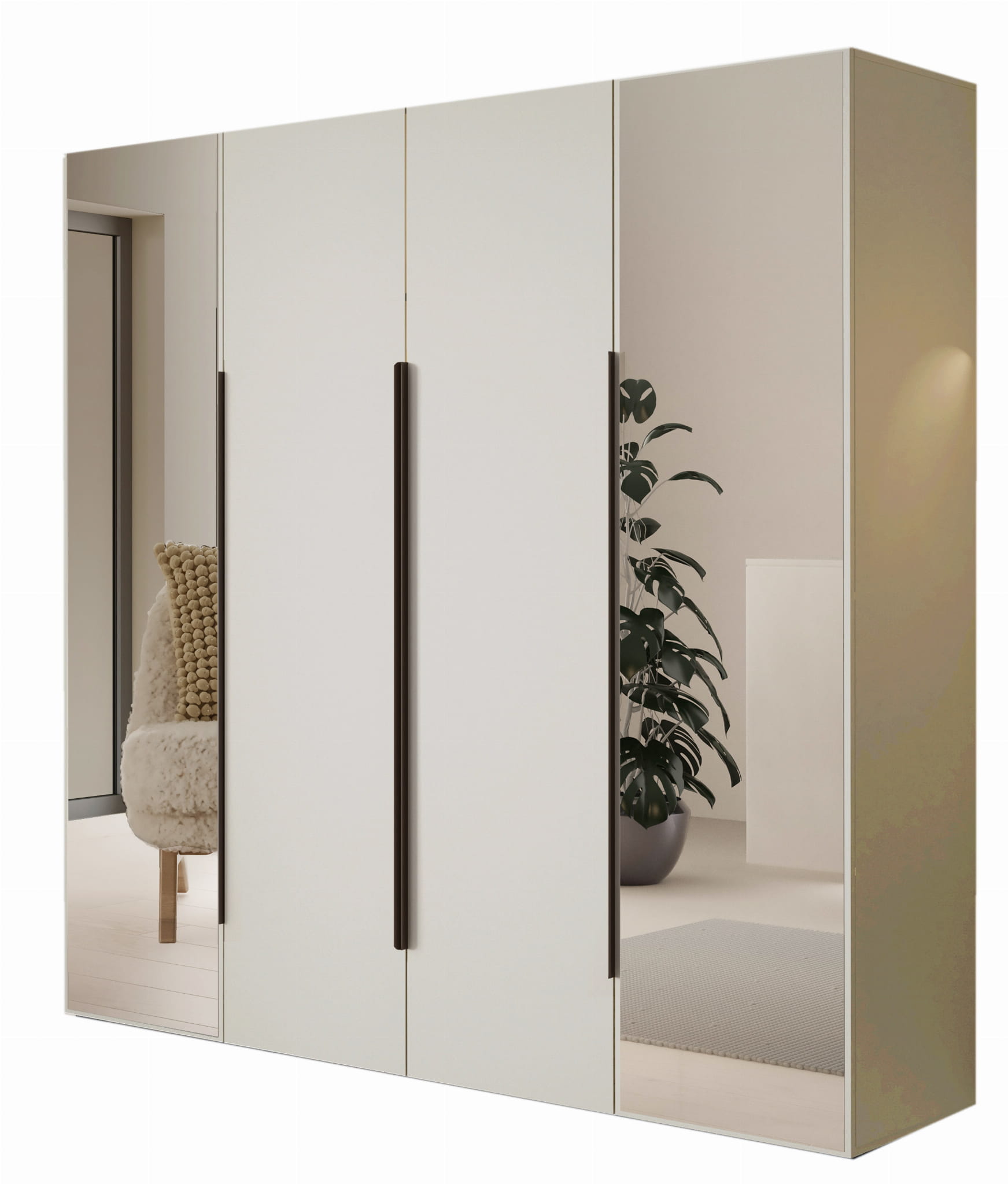 Szafa posiada 4 drzwi, z czego dwie frontowe powierzchnie wykończone są lustrami, które nie tylko optycznie powiększają przestrzeń, ale także pełnią funkcję praktycznego zwierciadła do codziennego użytku. Dzięki temu mebel jest nie tylko pojemny, ale i wyjątkowo funkcjonalny. Ponadto wnętrze szafy oferuje drążek na ubrania, półki oraz przestrzeń do przechowywania dodatków, co pozwala na wygodną organizację garderoby. Duża pojemność magazynowa zapewnia miejsce na odzież, buty i akcesoria, pomagając utrzymać porządek w domu.
