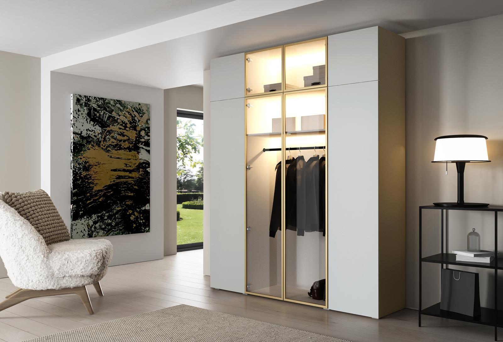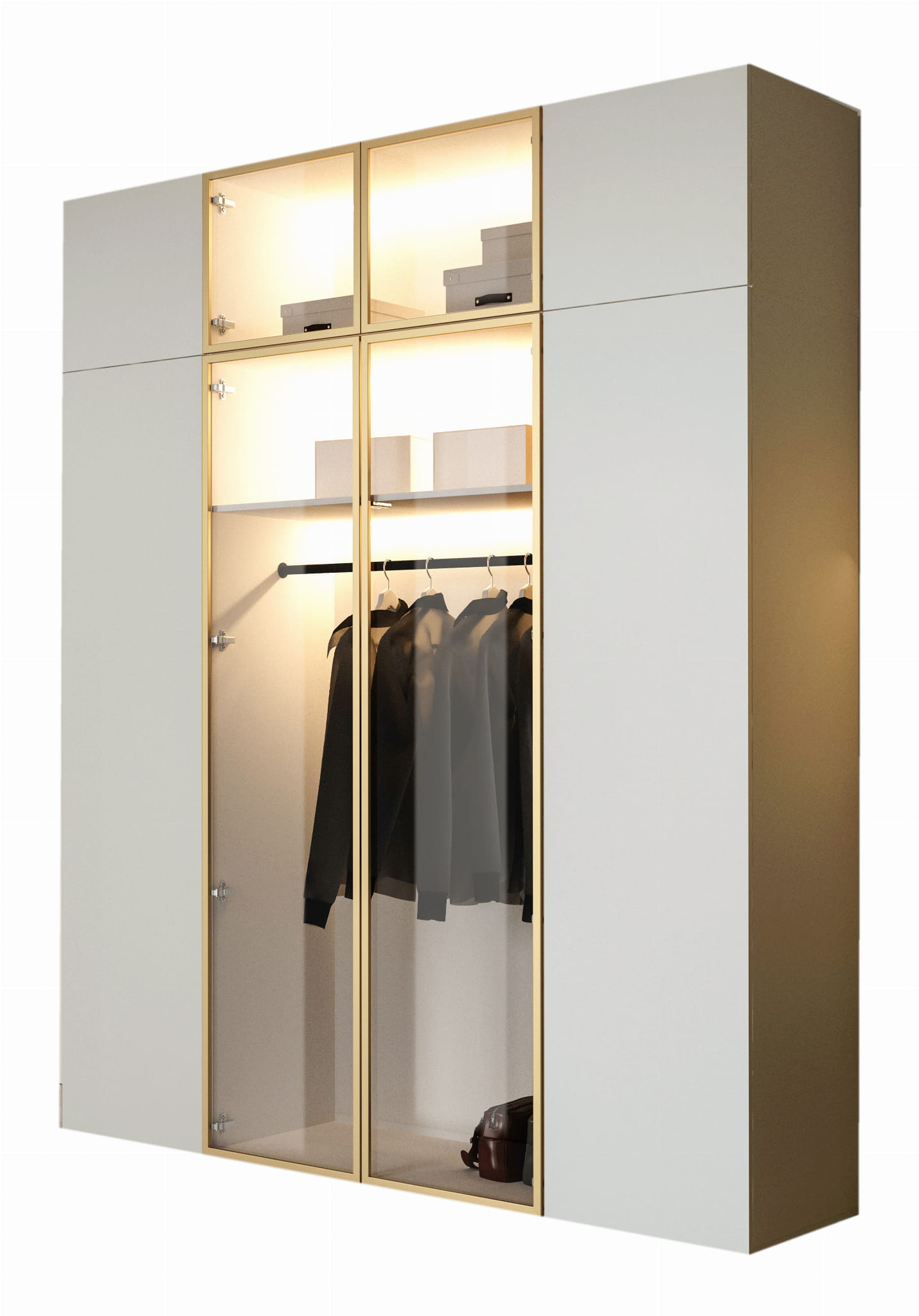 Wewnątrz szafy znajduje się solidny drążek na ubrania, który umożliwia wygodne wieszanie marynarek, sukienek i płaszczy. Liczne półki i schowki pozwalają na przechowywanie ubrań, akcesoriów czy pudełek, a dzięki nadstawce zyskujemy jeszcze więcej miejsca na rzeczy sezonowe lub rzadziej używane. Ponadto elegancki szklany front nadaje wnętrzu nowoczesnego charakteru, a w połączeniu z subtelnym oświetleniem LED pozwala w efektowny sposób wyeksponować garderobę.