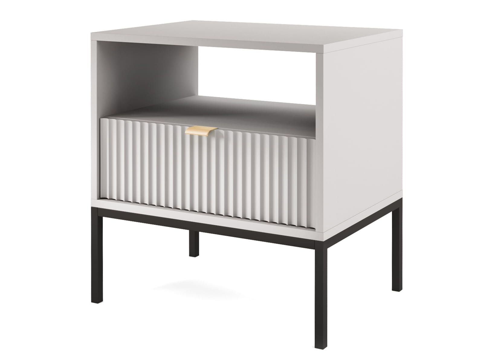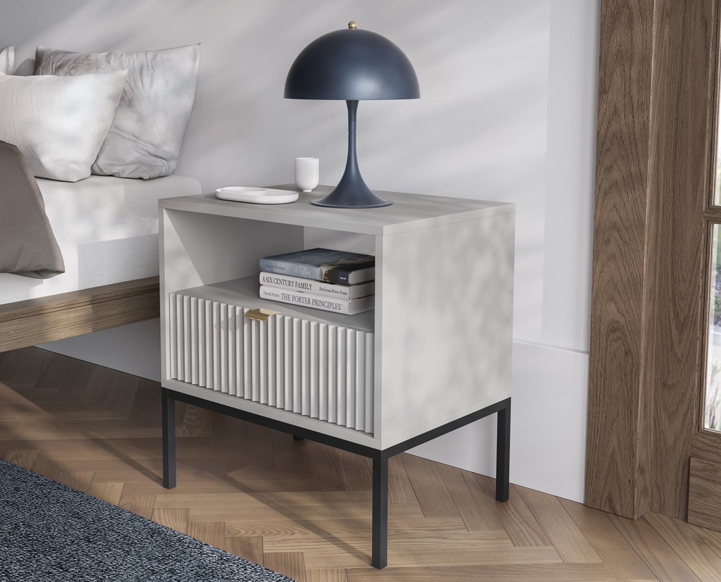 Stolik nocny w nowoczesnym stylu to doskonały wybór do każdej sypialni. Ryflowane fronty, będące topowym trendem tego sezonu, nadają meblowi niepowtarzalny wygląd, a złote minimalistyczne uchwyty podkreślają elegancję i luksusowy charakter.