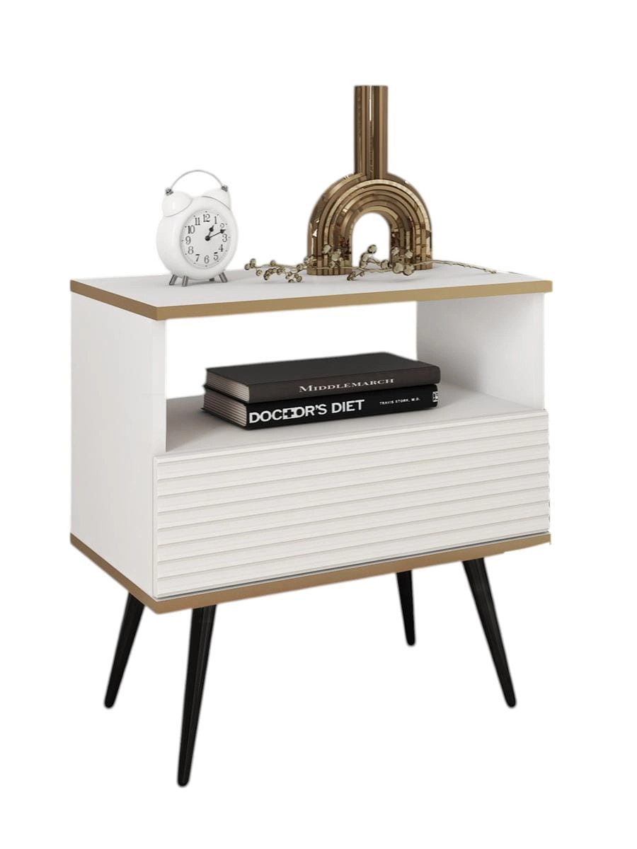 Elegancki stolik nocny w śnieżnobiałym kolorze z kontrastującymi czarnymi nóżkami i ozdobnym, ryflowanym frontem to wyjątkowe połączenie funkcjonalności i nowoczesnego designu. Jego lekka, geometryczna forma sprawia, że idealnie pasuje zarówno do wnętrz skandynawskich, modern classic, jak i loftowych czy glamour. Biały korpus w zestawieniu z czarnymi, smukłymi nóżkami tworzy efektowny kontrast, a ryflowany front dodaje meblowi charakteru i subtelnej, dekoracyjnej głębi.