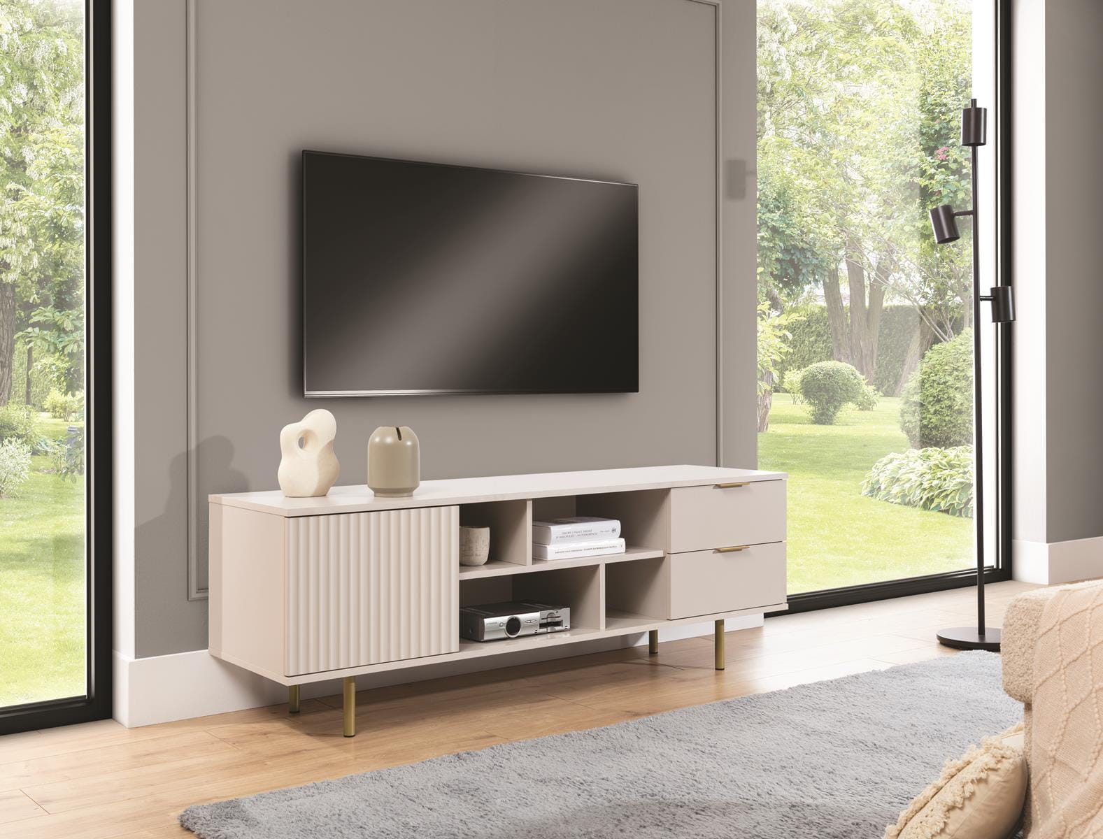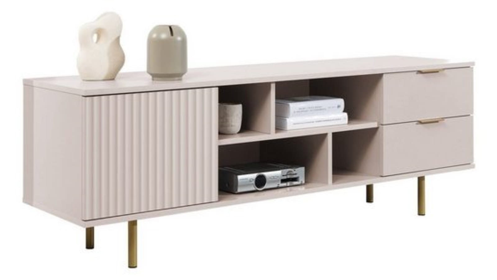 Kaszmirowy odcień w połączeniu ze złotymi, smukłymi nóżkami tworzy harmonijną całość , która świetnie wpisuje się zarówno w klasyczne, jak i nowoczesne aranżacje wnętrz. Dzięki pojemnym szufladom z łatwością uporządkujesz wszystkie niezbędne akcesoria RTV.