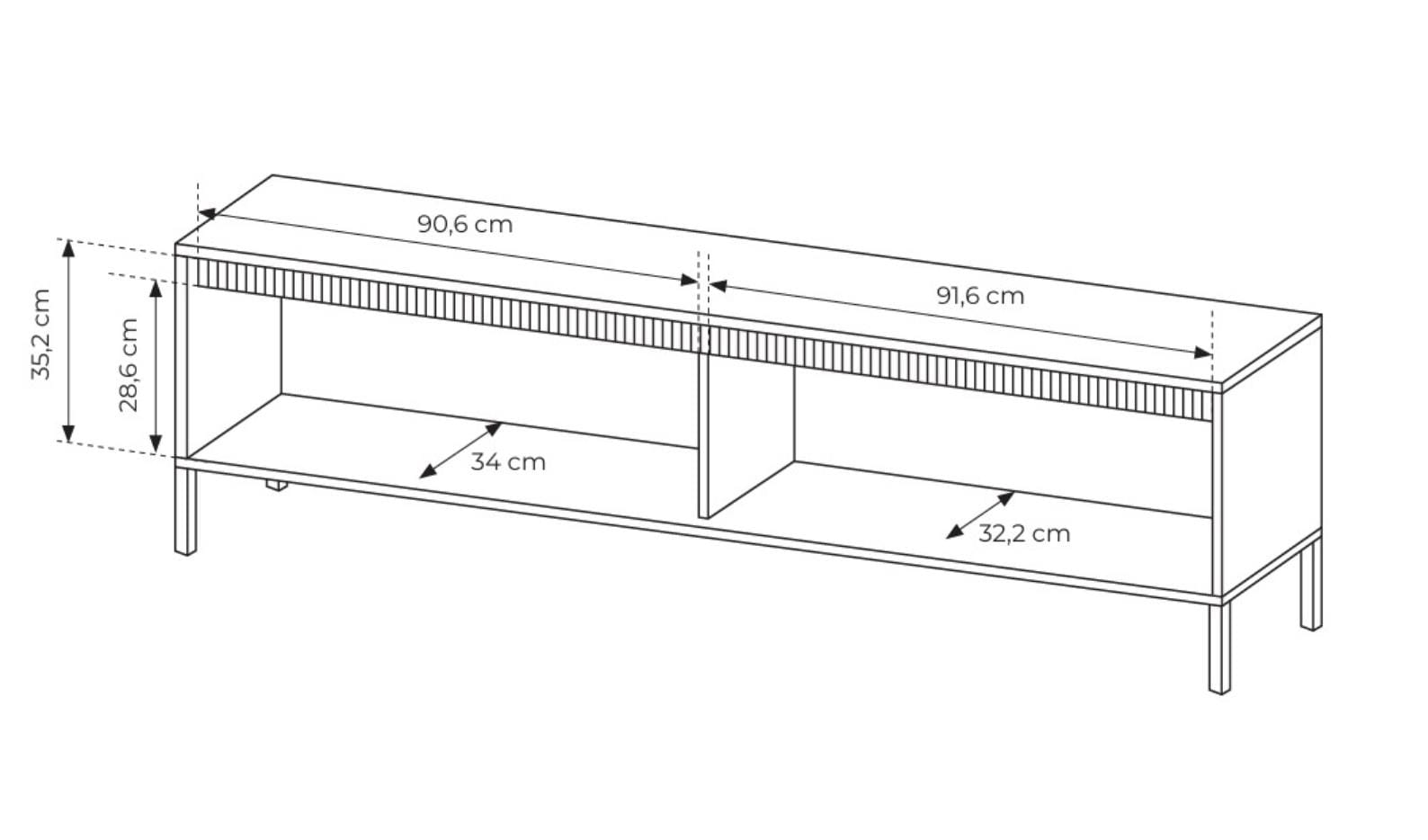 Mebel oferuje przestronną i dobrze zorganizowaną przestrzeń do przechowywania. Zamykane szafki pozwalają ukryć sprzęt RTV, dokumenty oraz akcesoria, pomagając utrzymać porządek w salonie. Szeroki blat zapewnia stabilne miejsce na telewizor, dekoracje lub sprzęt audio, co czyni tę szafkę praktycznym centrum domowej rozrywki.