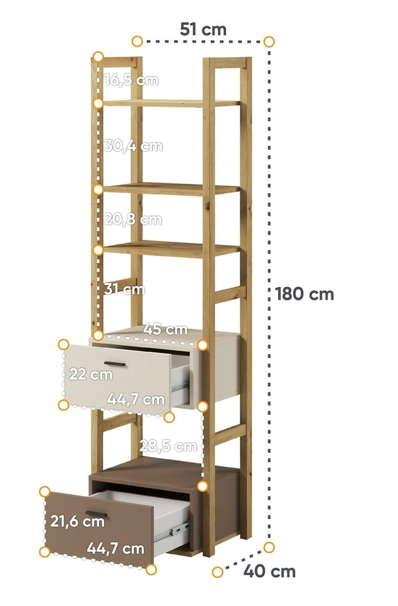 Nowoczesne połączenie beżowych elementów z dekorem dąb artisan nadaje regałowi ponadczasowego charakteru i sprawia, że świetnie pasuje do młodzieżowych aranżacji w różnych stylach. Jasna kolorystyka optycznie powiększa wnętrze, a naturalne akcenty drewna wprowadzają ciepło i przytulny klimat do pokoju dziecka czy nastolatka.
