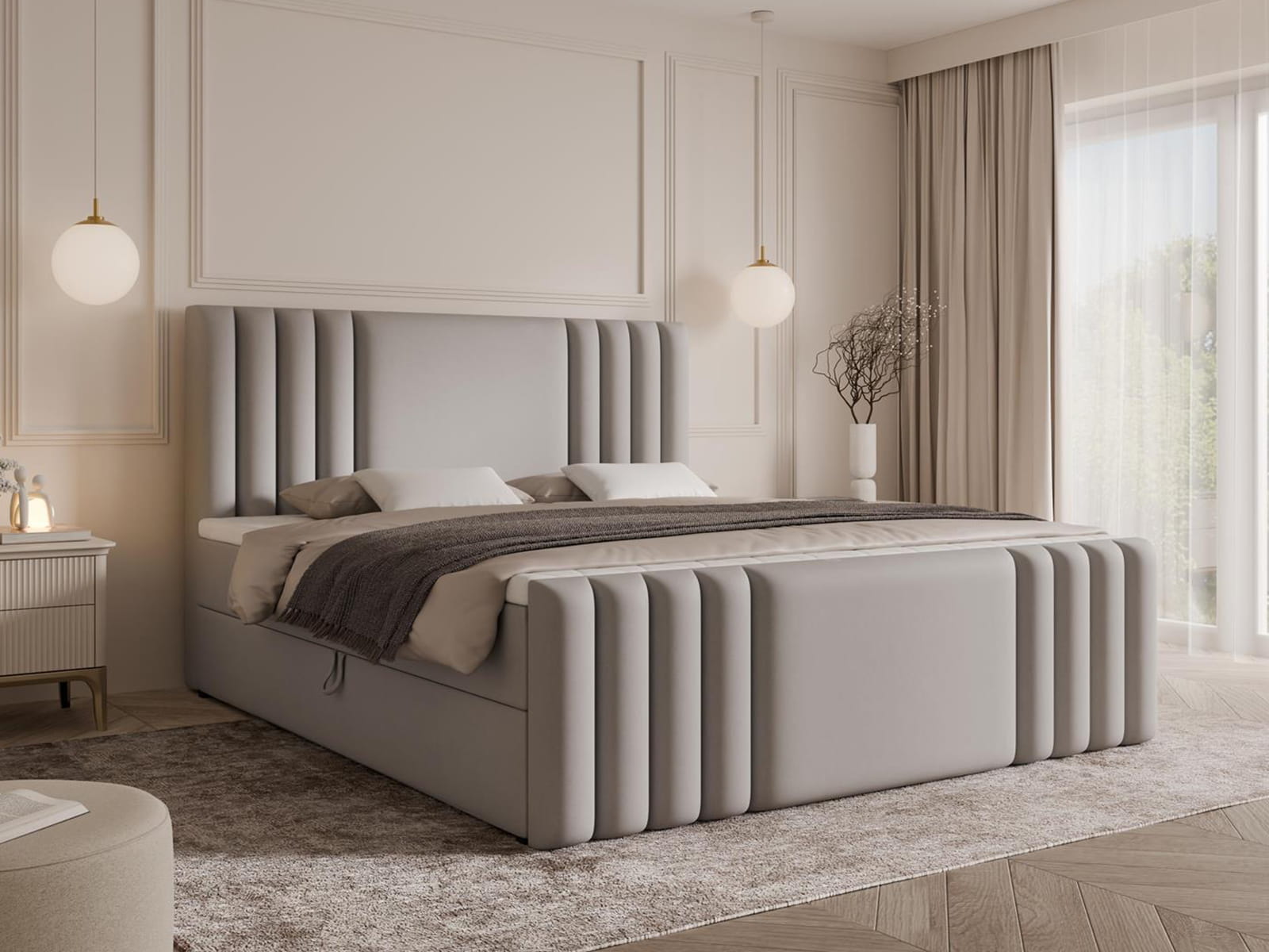 Konstrukcja kontynentalna zapewnia wysoki komfort snu oraz wygodne użytkowanie każdego dnia. Tapicerowane wezgłowie z pionowymi przeszyciami pełni funkcję dekoracyjną i praktyczną, zapewniając wygodne oparcie podczas czytania lub odpoczynku. Model wyposażony jest w dwie osobne, otwierane skrzynie na pościel. Mechanizm otwierania jest prosty i wygodny w codziennym użytkowaniu.