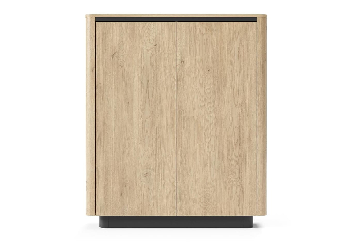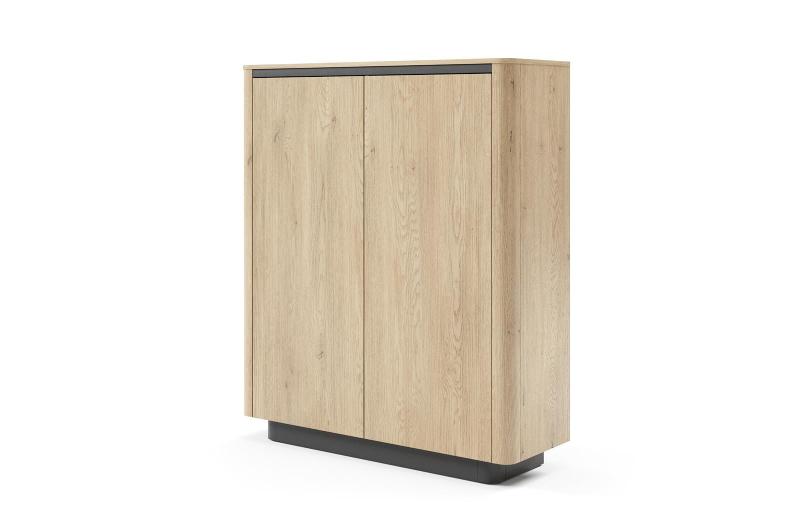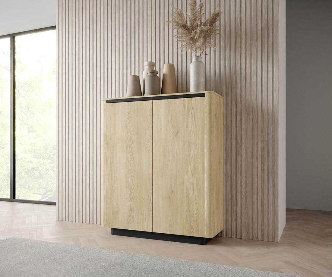 Wysoka komoda COLLECT to funkcjonalny mebel stworzony z myślą o nowoczesnych i uporządkowanych wnętrzach. Jej dwudrzwiowa konstrukcja skrywa pojemne półki, które z łatwością pomieszczą tekstylia, dokumenty, akcesoria domowe lub garderobę sezonową. Minimalistyczne wzornictwo, ciepły odcień naturalnego drewna i gładkie, bezuchwytowe fronty nadają meblowi elegancję i ponadczasowy styl.