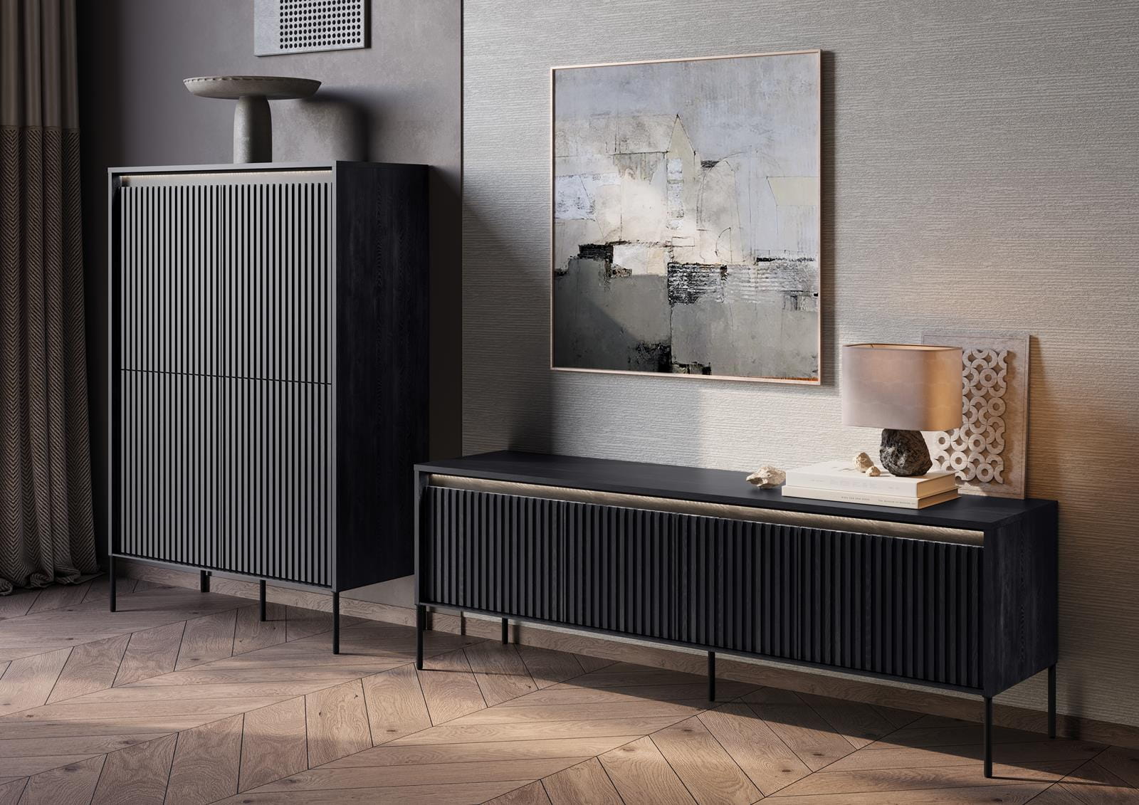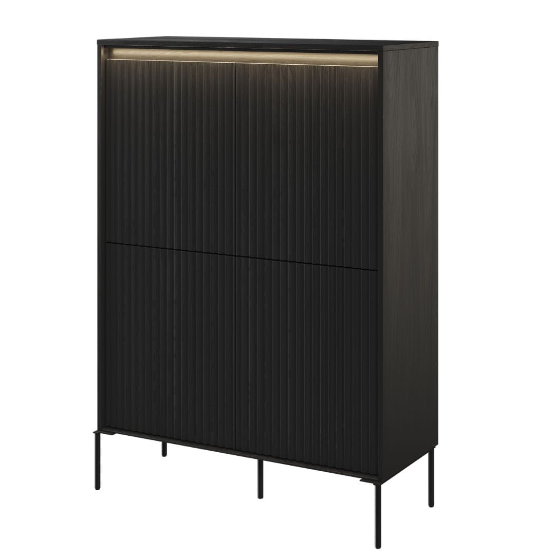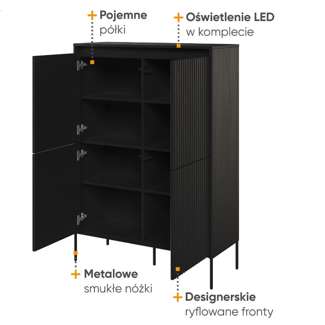 Wysoka ryflowana komoda do salonu z oświetleniem LED FLORES