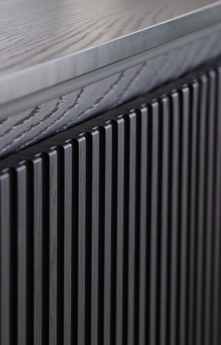 Fronty komody wykończone zostały charakterystycznym ryflowaniem, które nadaje jej wyjątkowego charakteru i sprawia, że staje się ozdobą każdego wnętrza. Wbudowane oświetlenie LED dodatkowo podkreśla elegancję mebla i tworzy przyjemny klimat w pomieszczeniu. System bezuchwytowy typu push-to-open wpisuje się w minimalistyczny styl i zapewnia wygodę użytkowania - wystarczy lekkie naciśnięcie, aby otworzyć drzwi.